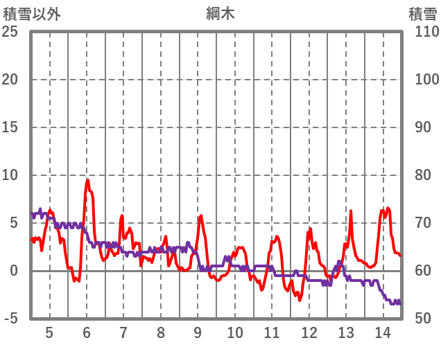 | 日 | 時 | 気温 | 降水 | 風向/風速 | 日照 | 積雪 | 降雪 |