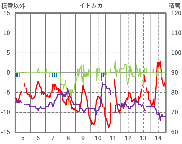 | 日 | 時 | 気温 | 降水 | 風向/風速 | 日照 | 積雪 | 降雪 |