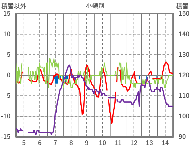| 日 | 時 | 気温 | 降水 | 風向/風速 | 日照 | 積雪 | 降雪 |