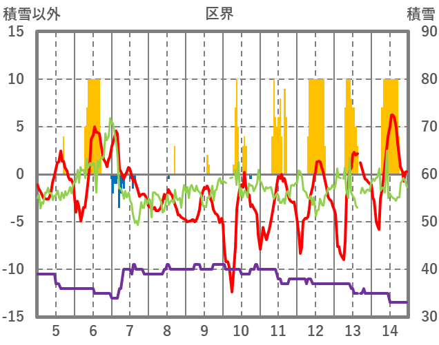 | 日 | 時 | 気温 | 降水 | 風向/風速 | 日照 | 積雪 | 降雪 |