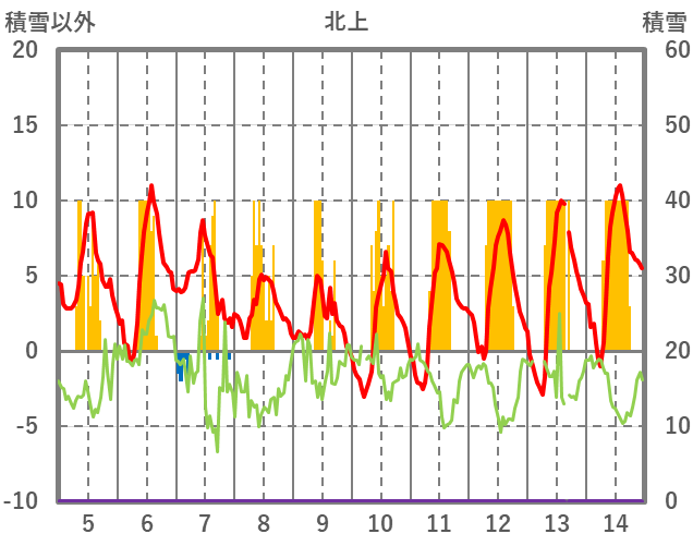 | 日 | 時 | 気温 | 降水 | 風向/風速 | 日照 | 積雪 | 降雪 |