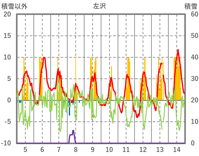 | 日 | 時 | 気温 | 降水 | 風向/風速 | 日照 | 積雪 | 降雪 |