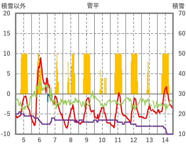 | 日 | 時 | 気温 | 降水 | 風向/風速 | 日照 | 積雪 | 降雪 |