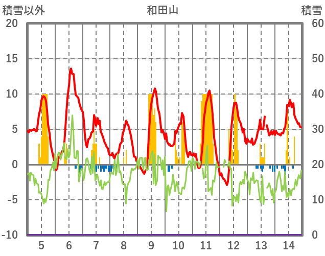 | 日 | 時 | 気温 | 降水 | 風向/風速 | 日照 | 積雪 | 降雪 |