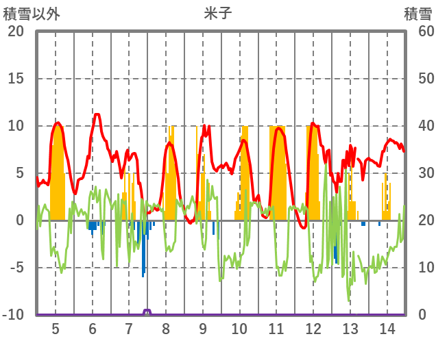| 日 | 時 | 気温 | 降水 | 風向/風速 | 日照 | 積雪 | 降雪 |