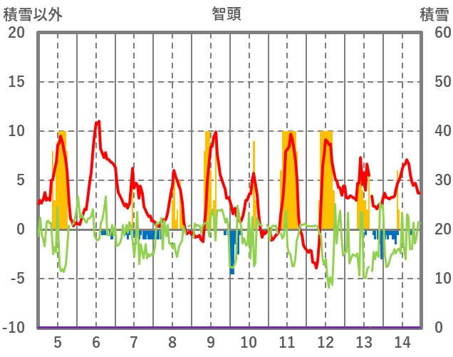 | 日 | 時 | 気温 | 降水 | 風向/風速 | 日照 | 積雪 | 降雪 |
