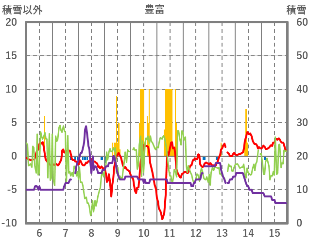 | 日 | 時 | 気温 | 降水 | 風向/風速 | 日照 | 積雪 | 降雪 |