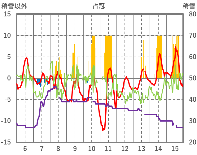 | 日 | 時 | 気温 | 降水 | 風向/風速 | 日照 | 積雪 | 降雪 |