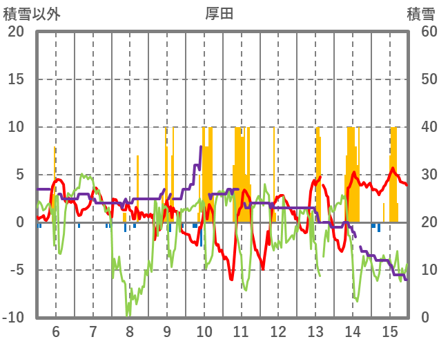 | 日 | 時 | 気温 | 降水 | 風向/風速 | 日照 | 積雪 | 降雪 |