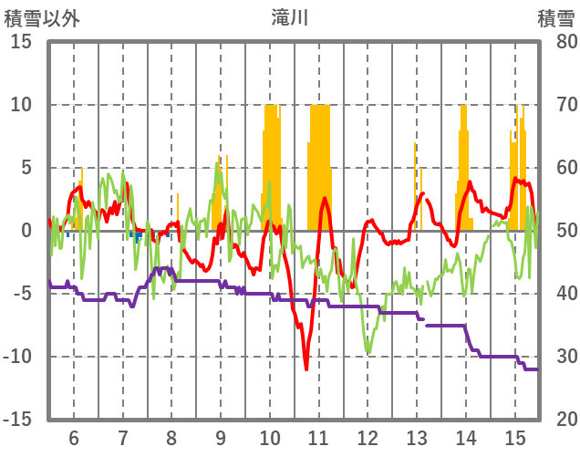 | 日 | 時 | 気温 | 降水 | 風向/風速 | 日照 | 積雪 | 降雪 |