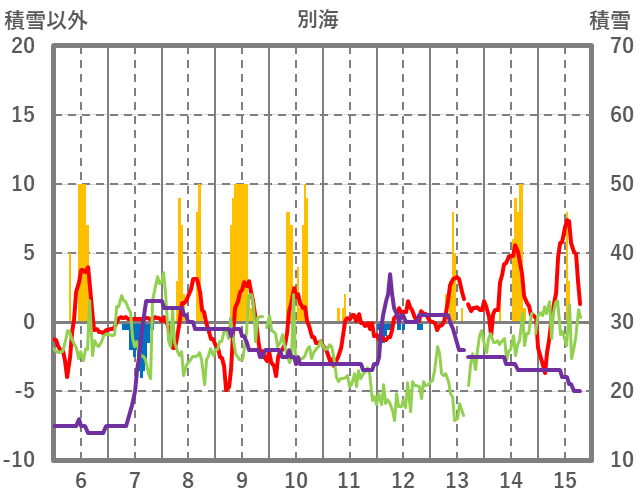 | 日 | 時 | 気温 | 降水 | 風向/風速 | 日照 | 積雪 | 降雪 |
