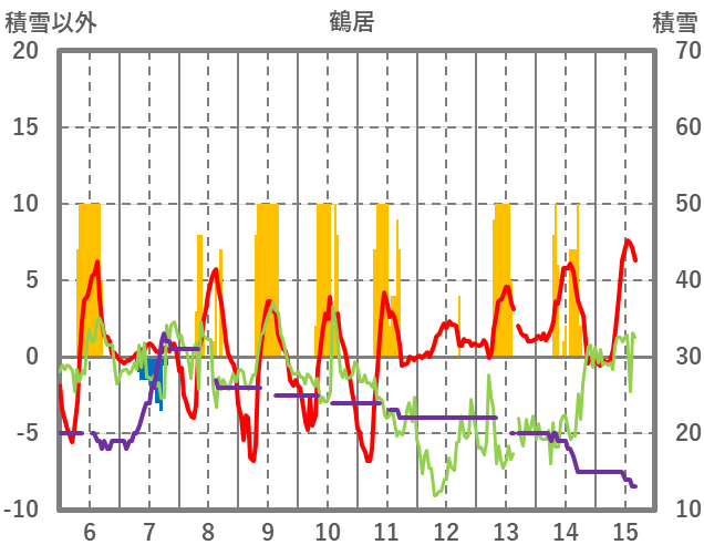 | 日 | 時 | 気温 | 降水 | 風向/風速 | 日照 | 積雪 | 降雪 |