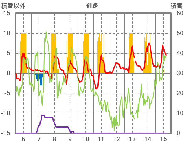 | 日 | 時 | 気温 | 降水 | 風向/風速 | 日照 | 積雪 | 降雪 |