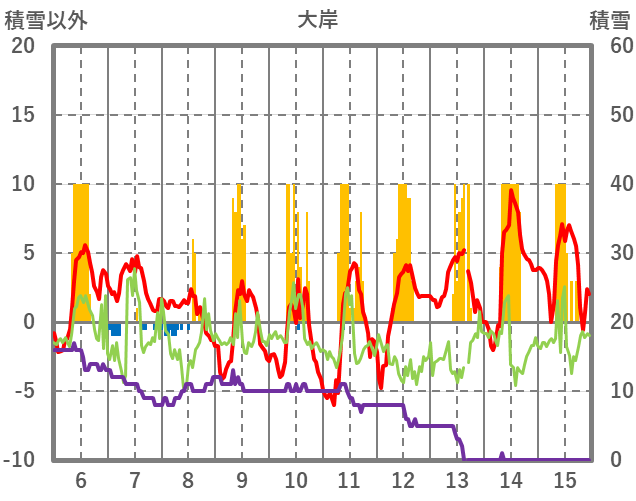 | 日 | 時 | 気温 | 降水 | 風向/風速 | 日照 | 積雪 | 降雪 |