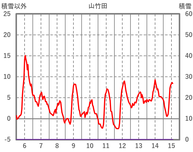 | 日 | 時 | 気温 | 降水 | 風向/風速 | 日照 | 積雪 | 降雪 |