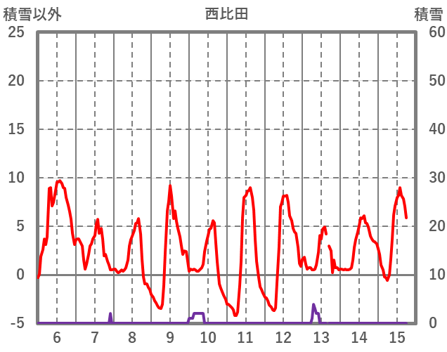 | 日 | 時 | 気温 | 降水 | 風向/風速 | 日照 | 積雪 | 降雪 |