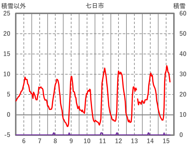 | 日 | 時 | 気温 | 降水 | 風向/風速 | 日照 | 積雪 | 降雪 |