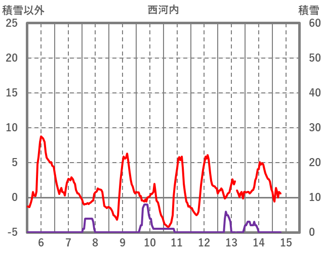| 日 | 時 | 気温 | 降水 | 風向/風速 | 日照 | 積雪 | 降雪 |