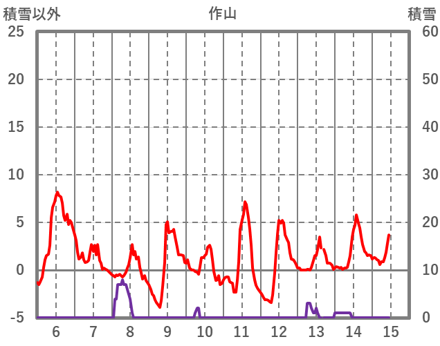 | 日 | 時 | 気温 | 降水 | 風向/風速 | 日照 | 積雪 | 降雪 |