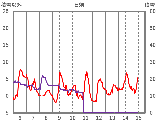 | 日 | 時 | 気温 | 降水 | 風向/風速 | 日照 | 積雪 | 降雪 |