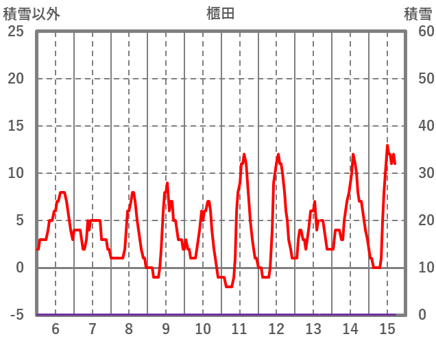 | 日 | 時 | 気温 | 降水 | 風向/風速 | 日照 | 積雪 | 降雪 |