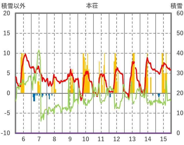 | 日 | 時 | 気温 | 降水 | 風向/風速 | 日照 | 積雪 | 降雪 |