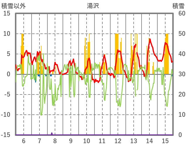 | 日 | 時 | 気温 | 降水 | 風向/風速 | 日照 | 積雪 | 降雪 |