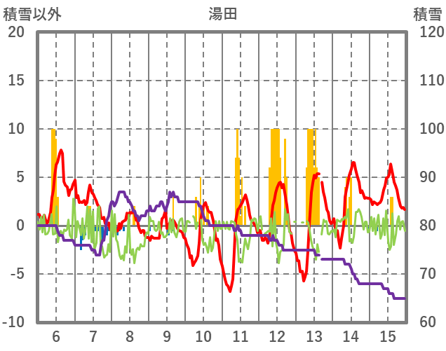 | 日 | 時 | 気温 | 降水 | 風向/風速 | 日照 | 積雪 | 降雪 |
