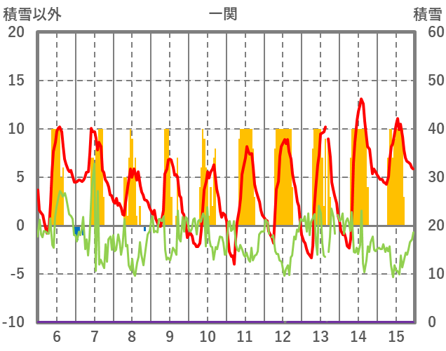 | 日 | 時 | 気温 | 降水 | 風向/風速 | 日照 | 積雪 | 降雪 |
