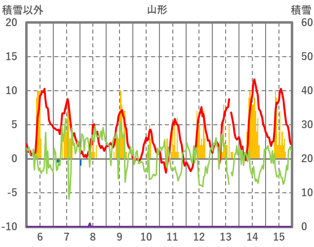 | 日 | 時 | 気温 | 降水 | 風向/風速 | 日照 | 積雪 | 降雪 |