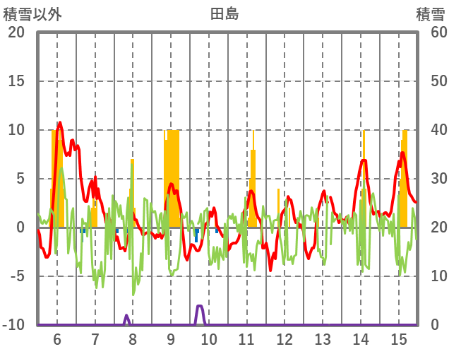 | 日 | 時 | 気温 | 降水 | 風向/風速 | 日照 | 積雪 | 降雪 |