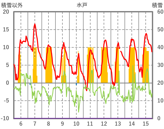 | 日 | 時 | 気温 | 降水 | 風向/風速 | 日照 | 積雪 | 降雪 |