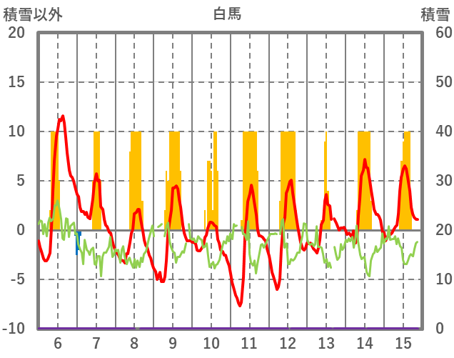 | 日 | 時 | 気温 | 降水 | 風向/風速 | 日照 | 積雪 | 降雪 |
