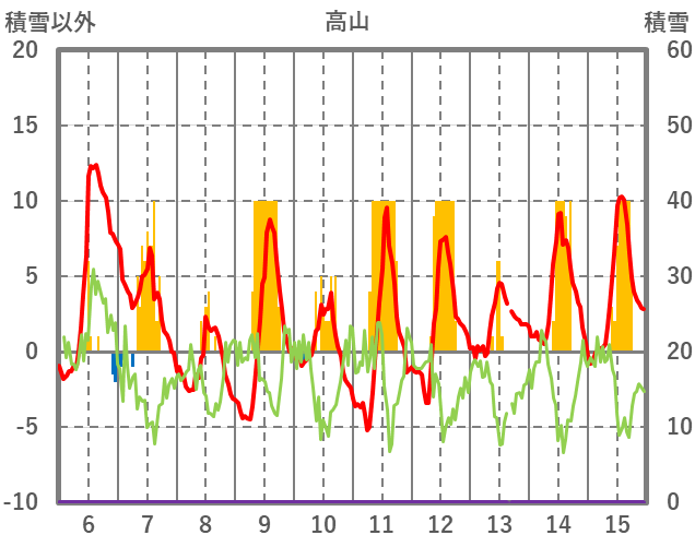 | 日 | 時 | 気温 | 降水 | 風向/風速 | 日照 | 積雪 | 降雪 |