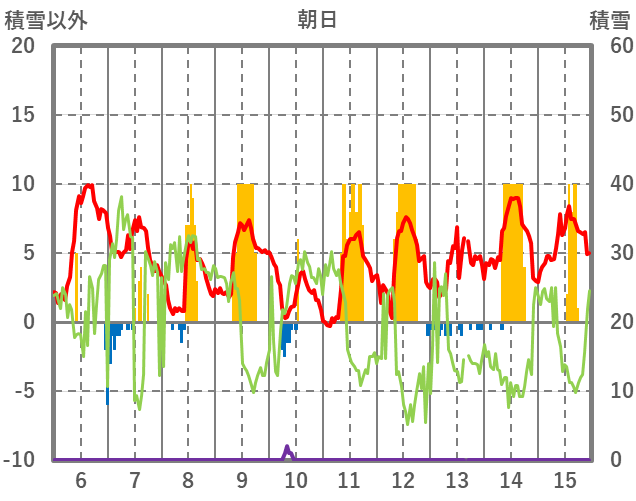 | 日 | 時 | 気温 | 降水 | 風向/風速 | 日照 | 積雪 | 降雪 |
