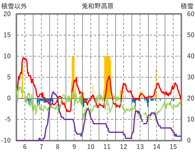 | 日 | 時 | 気温 | 降水 | 風向/風速 | 日照 | 積雪 | 降雪 |