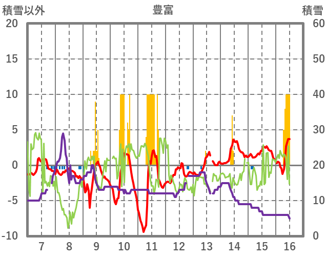| 日 | 時 | 気温 | 降水 | 風向/風速 | 日照 | 積雪 | 降雪 |