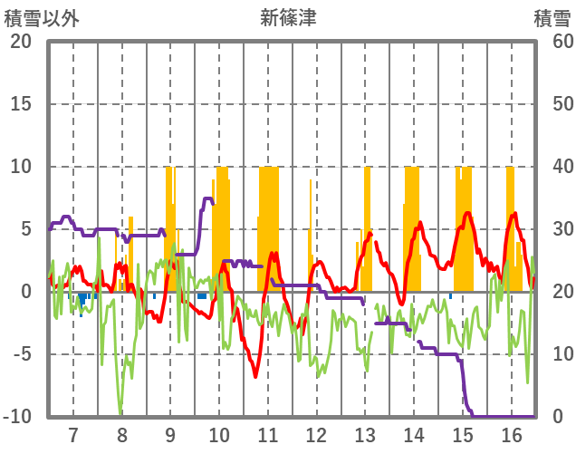 | 日 | 時 | 気温 | 降水 | 風向/風速 | 日照 | 積雪 | 降雪 |