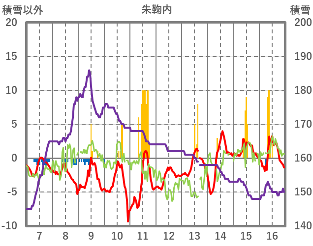 | 日 | 時 | 気温 | 降水 | 風向/風速 | 日照 | 積雪 | 降雪 |
