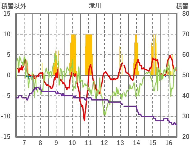 | 日 | 時 | 気温 | 降水 | 風向/風速 | 日照 | 積雪 | 降雪 |