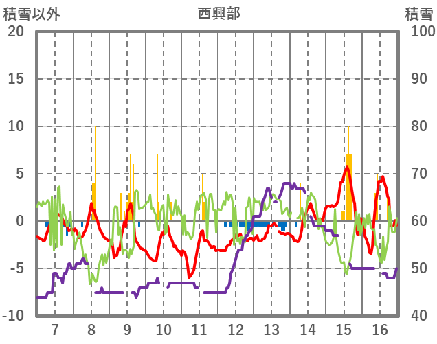 | 日 | 時 | 気温 | 降水 | 風向/風速 | 日照 | 積雪 | 降雪 |