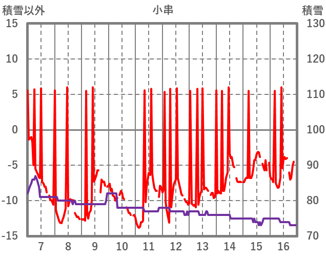 | 日 | 時 | 気温 | 降水 | 風向/風速 | 日照 | 積雪 | 降雪 |