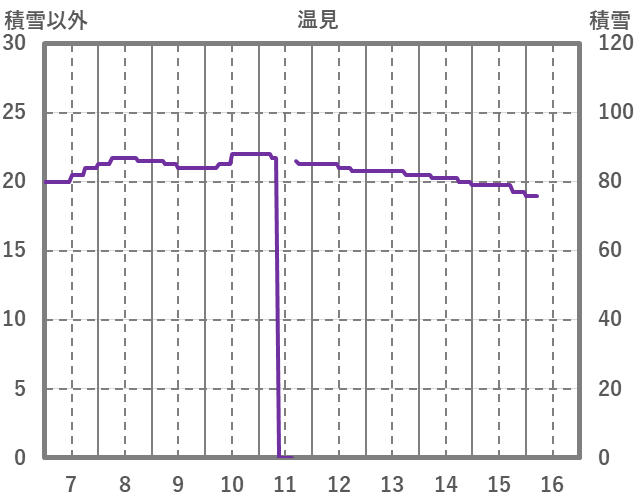 | 日 | 時 | 気温 | 降水 | 風向/風速 | 日照 | 積雪 | 降雪 |
