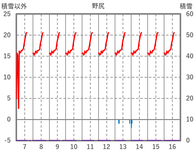 | 日 | 時 | 気温 | 降水 | 風向/風速 | 日照 | 積雪 | 降雪 |