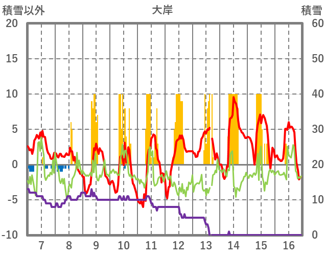 | 日 | 時 | 気温 | 降水 | 風向/風速 | 日照 | 積雪 | 降雪 |