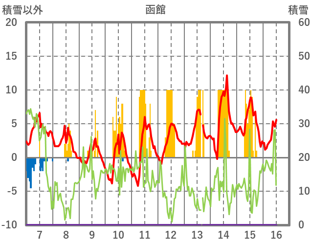 | 日 | 時 | 気温 | 降水 | 風向/風速 | 日照 | 積雪 | 降雪 |