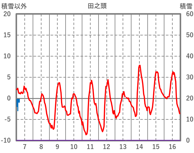 | 日 | 時 | 気温 | 降水 | 風向/風速 | 日照 | 積雪 | 降雪 |