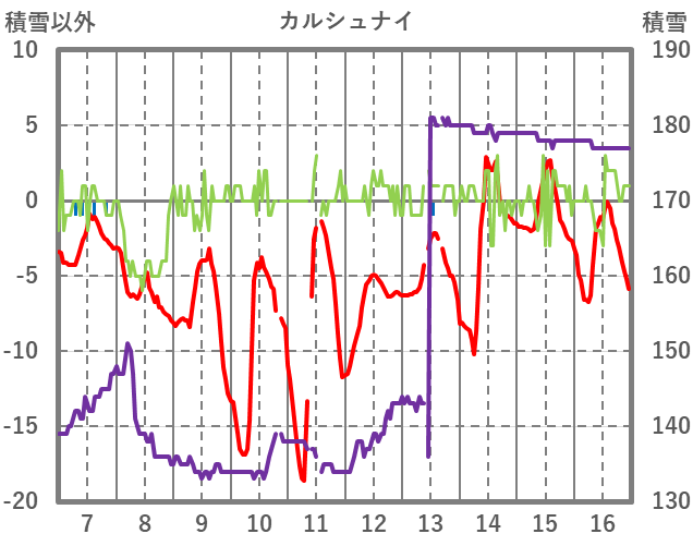 | 日 | 時 | 気温 | 降水 | 風向/風速 | 日照 | 積雪 | 降雪 |