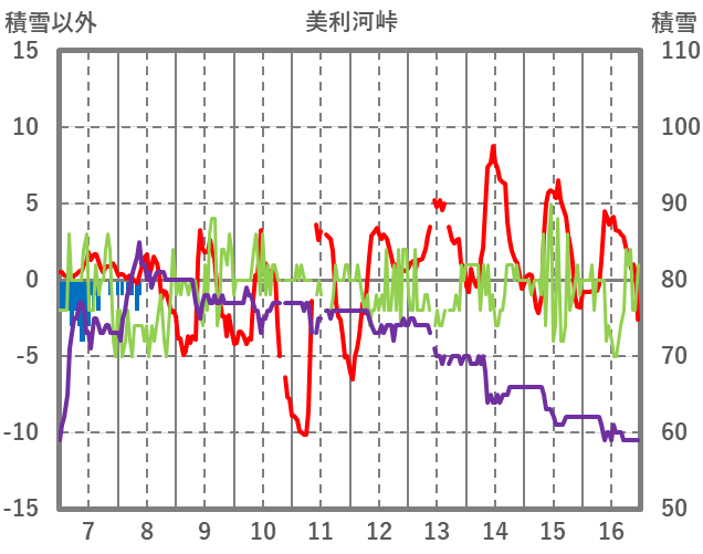 | 日 | 時 | 気温 | 降水 | 風向/風速 | 日照 | 積雪 | 降雪 |
