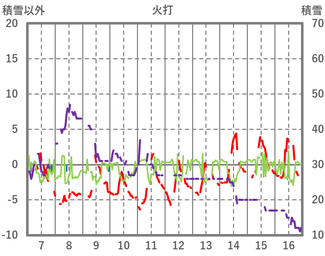 | 日 | 時 | 気温 | 降水 | 風向/風速 | 日照 | 積雪 | 降雪 |